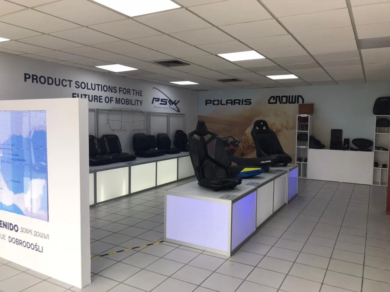 Desarrollamos un Showroom en la planta de Poliuretanos SW, para los productos de Polaris que se producen allí. Compusimos el área con perfiles industriales, cajas de luz, leds de color azul y con una pantalla transparente, que da la bienvenida a la recepción y showroom.