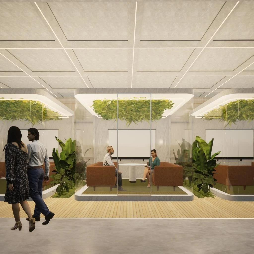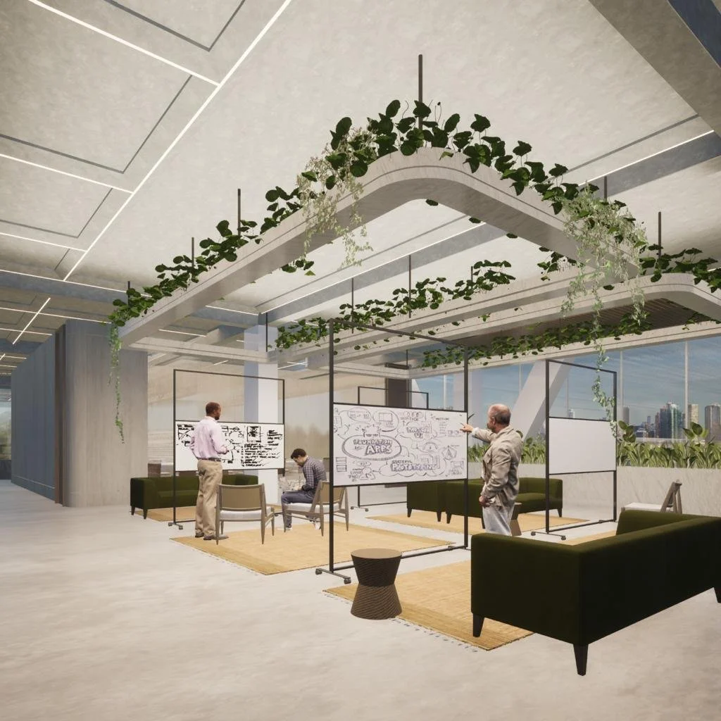 Este proyecto fue para unas oficinas privadas, buscaban un look biofílico, lleno de plantas y naturaleza en el interior para generar creatividad y tranquilidad. Al igual que transparencias con elementos como el vidrio templado o acrilicos clear.